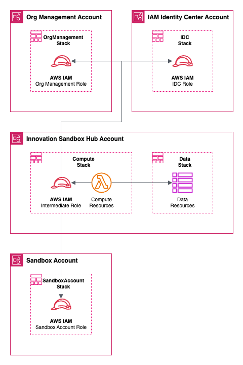- The IAM Identity Center (IDC) stack deployed into the AWS Account containing the organizations AWS IAM Identity Center instance is used to manage the solution web UI and sandbox account access (groups and permission sets).