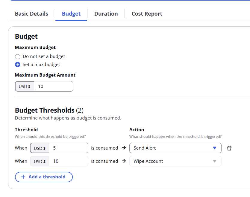 In our case, when the budget (10$) is consumed, we automatically wipe the account: