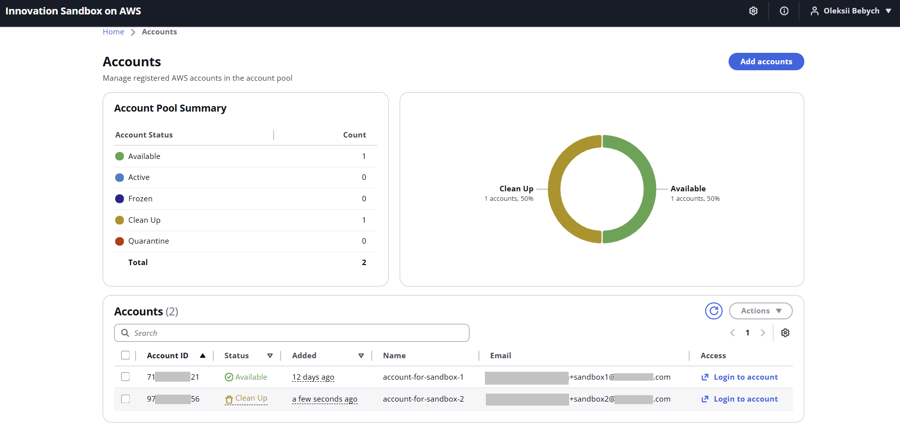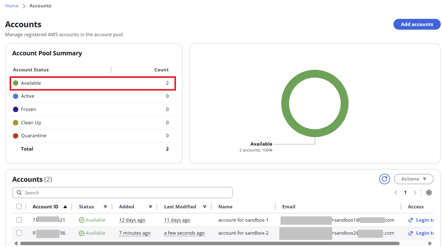 Once you add a new AWS account to the Sandbox pool, it will be automatically cleaned by the AWS Nuke tool. “Available” accounts can be requested by users: