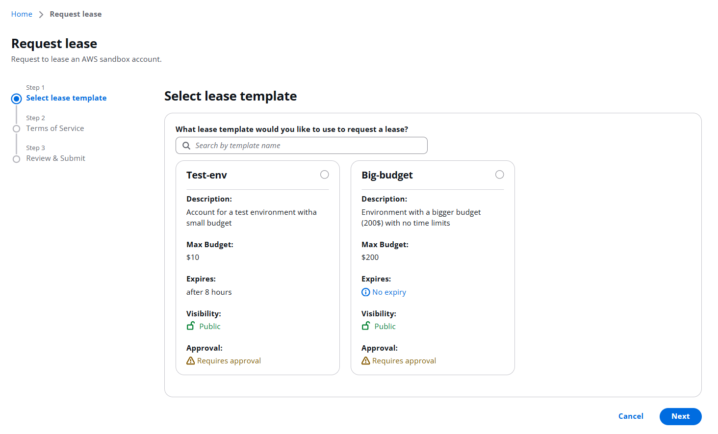 A user can request a Lease from the available templaces, which were previously created by an Admin: