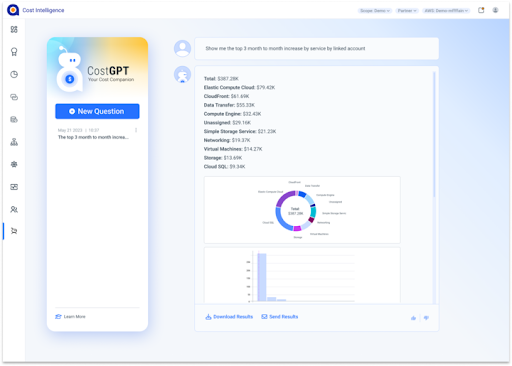 CostGPT uses Natural Language Processing (NLP) to simplify cloud cost management through conversational analytics. Users intuitively interact with their cloud cost data, asking questions in natural language to retrieve detailed insights and take informed actions quickly.