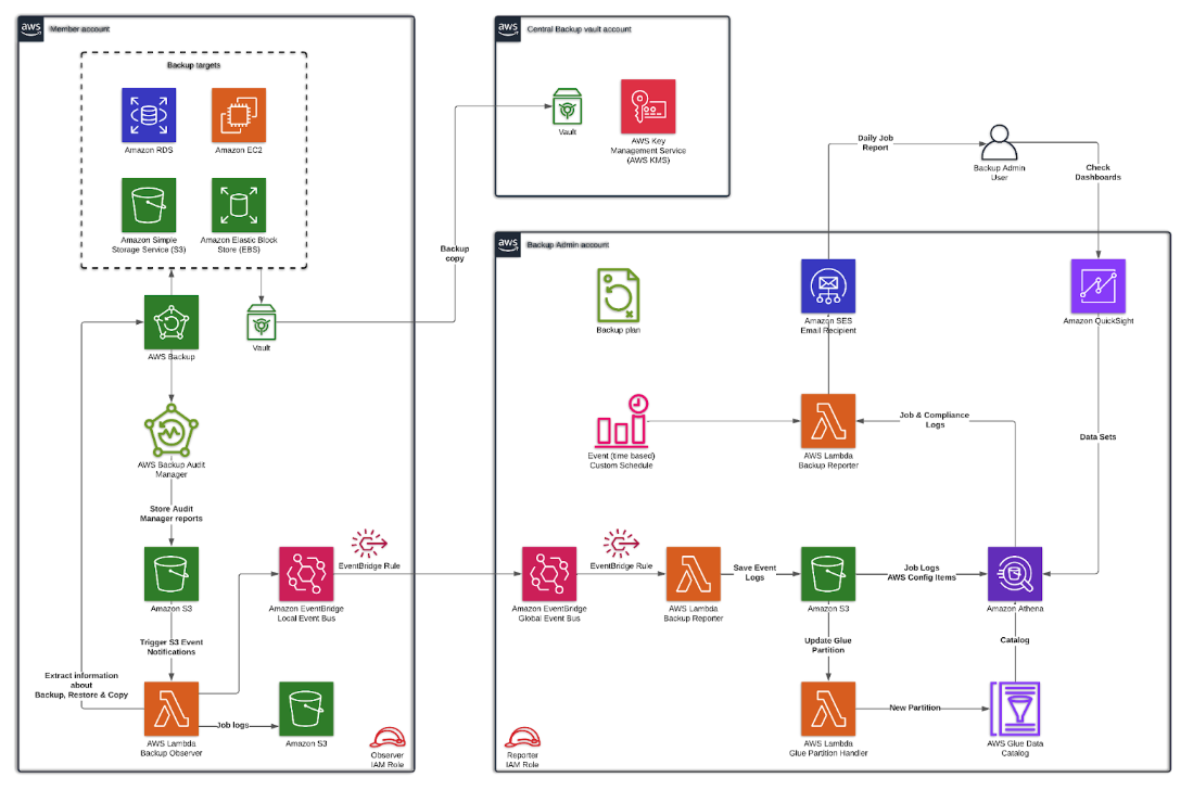 - Automatically generate, store, and email out daily reports: The deployed solution provides a set of aggregated daily job reports that are cross-account and multi-region based. These reports are stored in a central S3 bucket, enabling customers to access historical backup reports as required.