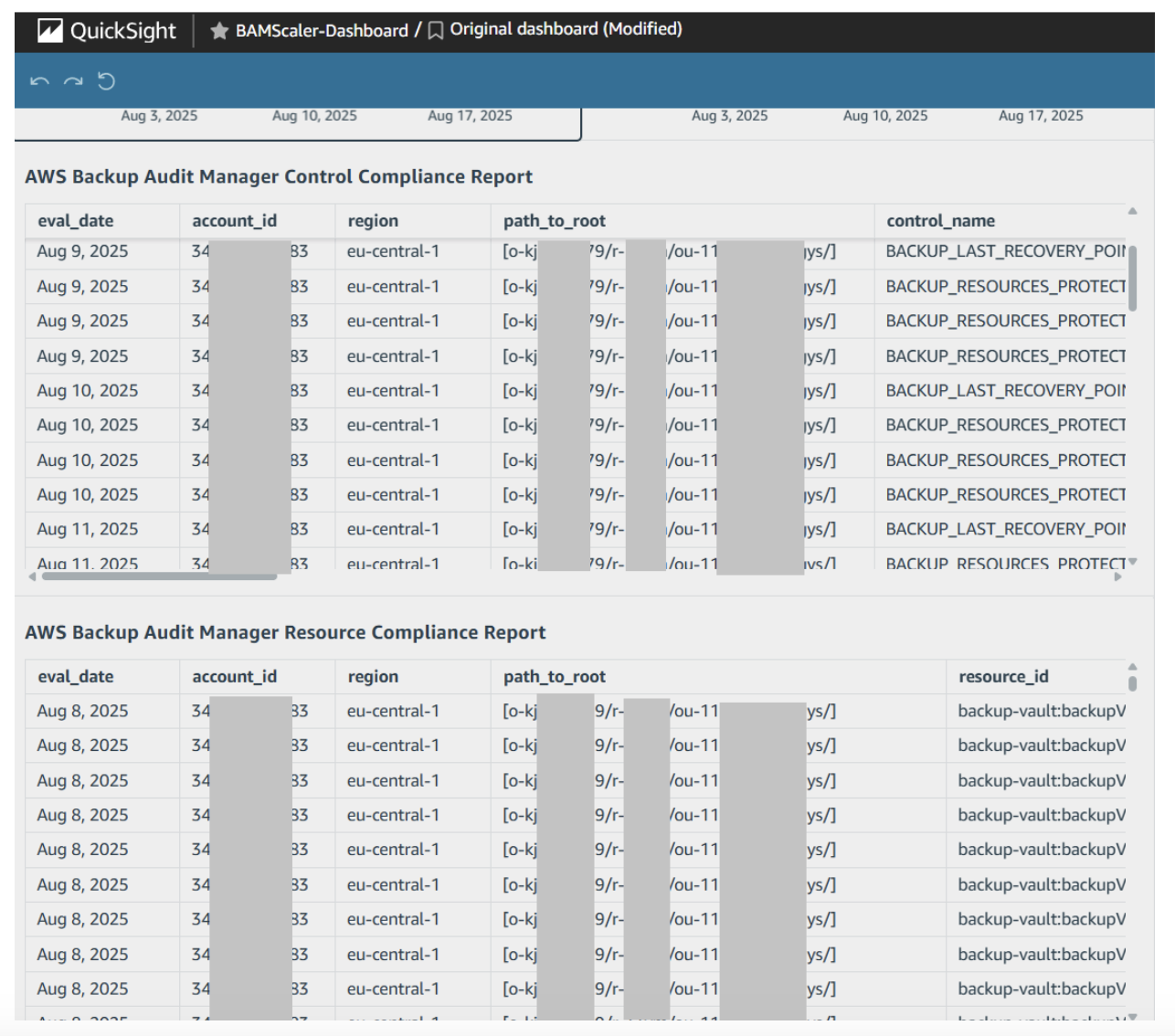AWS Backup Audit Manager was used across the member accounts in the freeTV organization, and its findings are summarized in Amazon QuickSight dashboards. An additional output from this solution is organization-wide compliance reports that can help freeTV demonstrate compliance with regulatory requirements.